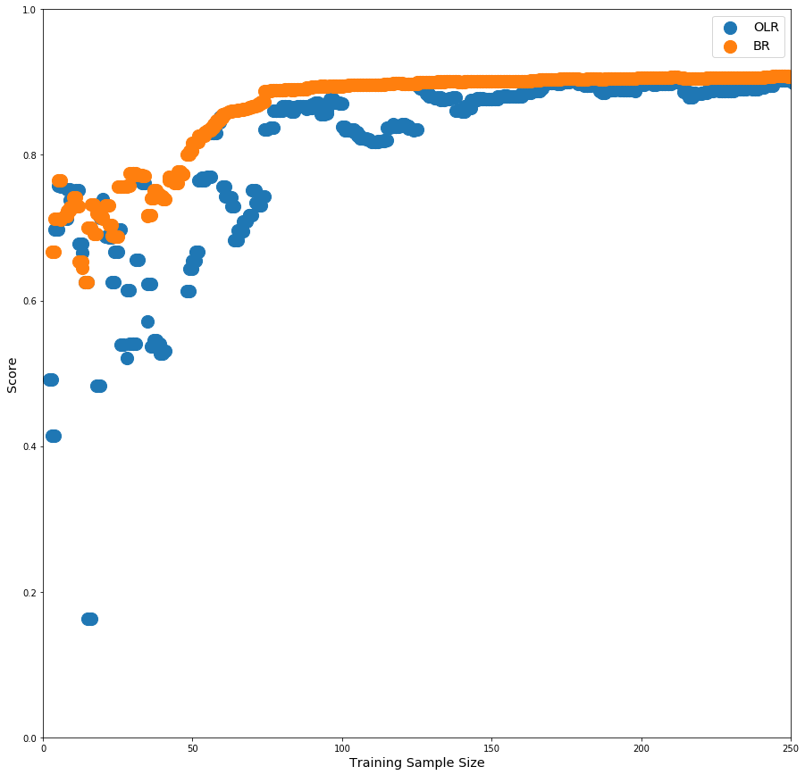 ax1.scatter(df.trainsize, df.linreg_score, label='OLR', s=200)