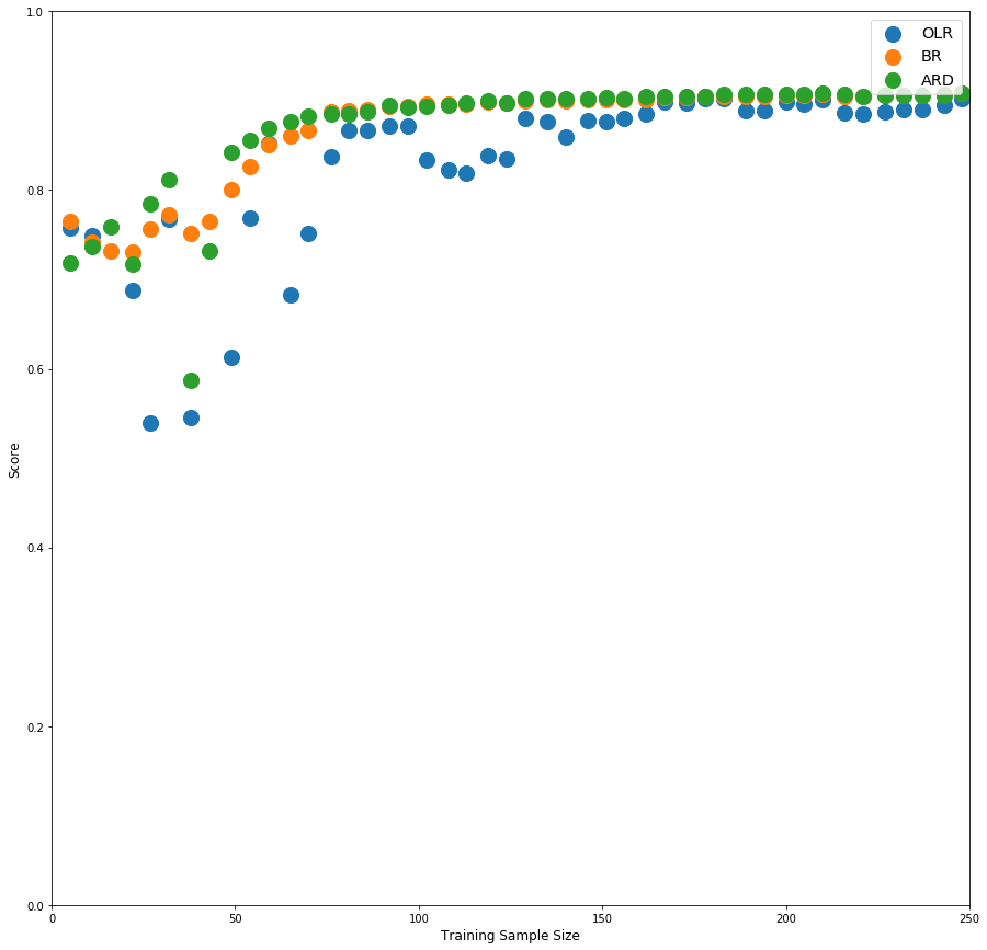 scikit-learn has one more Bayesian regression model type: Automatic Relevance Determination Regression (ARD). Let's also see how this perform the models we tried so far. Note that ARD is much more computationally intensive procedure as opposed to BR and OLR.