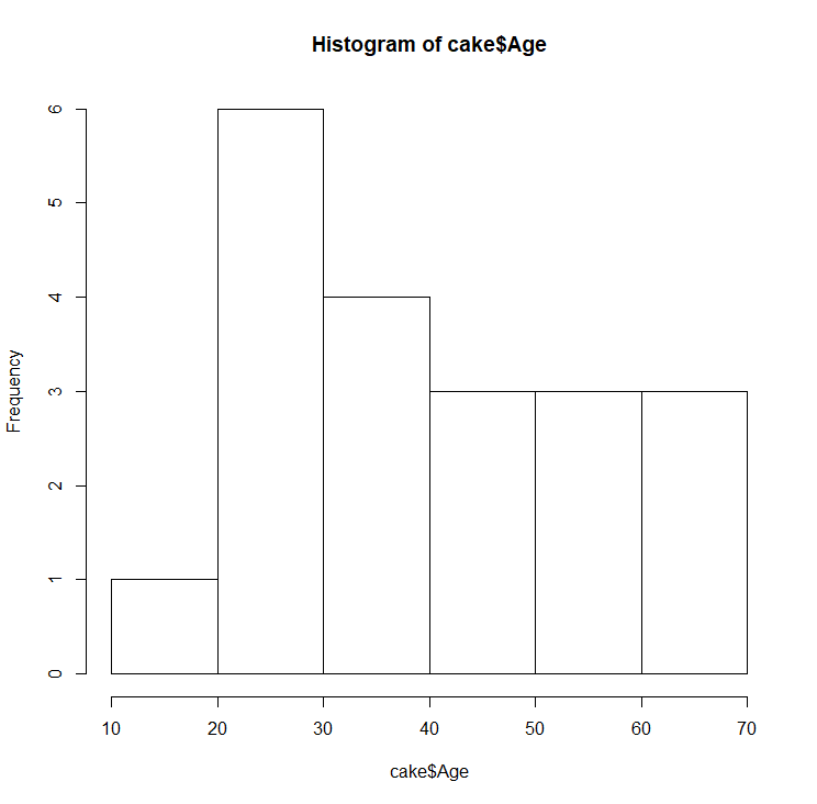 Shapiro-Wilk normality test data: cake$Age W = 0.93464, p-value = 0.1895