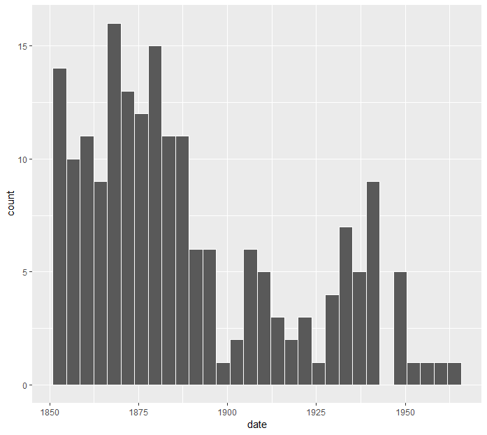 > ggplot(data=coal) + geom_histogram(aes(date))