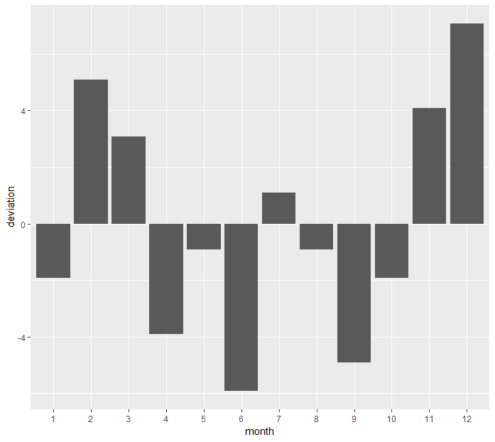 > ggplot(data=coal_month_2) + geom_bar(aes(x=month, y=deviation), stat='identity')