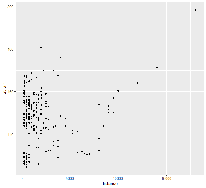 > ggplot(data=frogs) + geom_point(mapping=aes(x=distance,y=avrain))