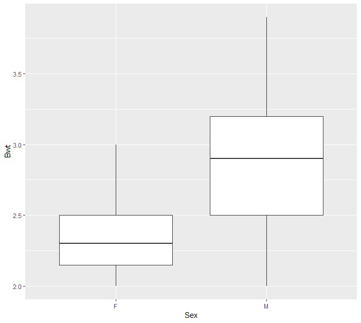 > ggplot(cats, aes(x=Sex, y=Bwt)) + geom_boxplot())