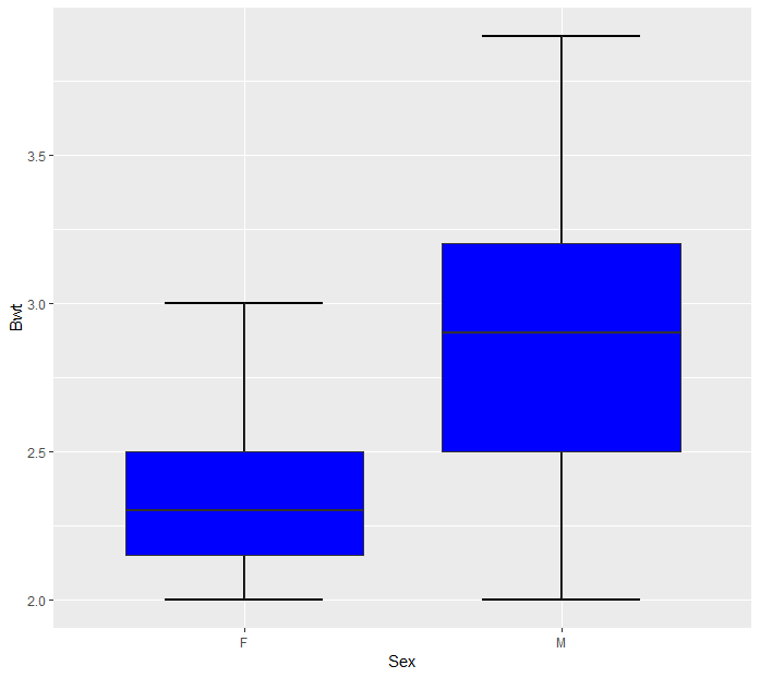 > ggplot(cats, aes(x = Sex, y = Bwt)) + stat_boxplot(geom = "errorbar", width = 0.5, size=1) + geom_boxplot(fill="blue")