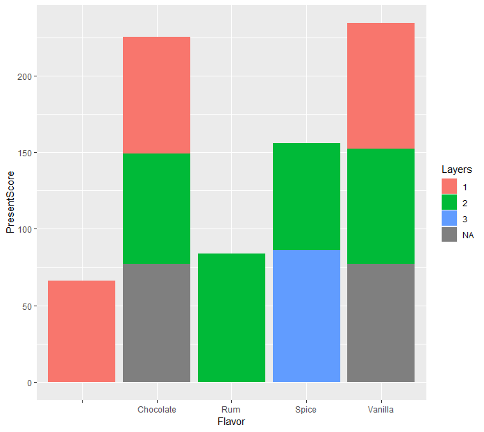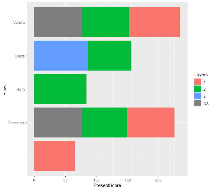 > ggplot(data=cake) + geom_bar(mapping = aes(x=Flavor, y=PresentScore, fill=Layers), stat="summary", fun.y="mean") + coord_flip()