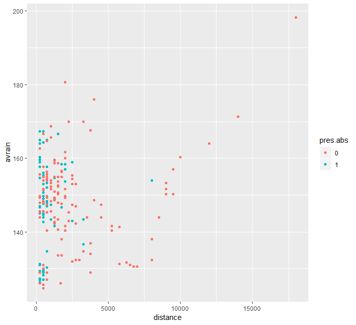 > ggplot(data=frogs) + geom_point(mapping=aes(x=distance,y=avrain, color=pres.abs))