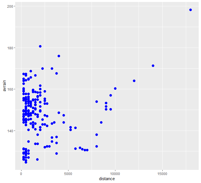 > ggplot(data=frogs) + geom_point(mapping=aes(x=distance,y=avrain),color="blue", size=3)