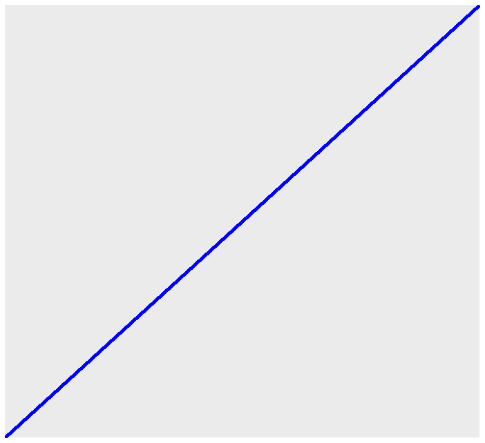 > ggplot() + geom_abline(intercept=0, slope=1, size=2, color="blue")