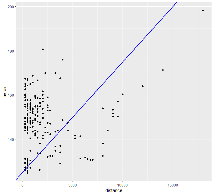 > ggplot(data=frogs) + geom_point(mapping=aes(x=distance,y=avrain)) + geom_abline(slope=0.005, intercept=125, size=1, color="blue")