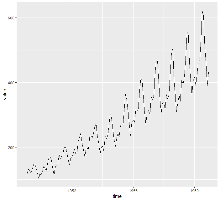 > ggplot(data=airpassenger) + geom_line(mapping = aes(x=time, y=value))
