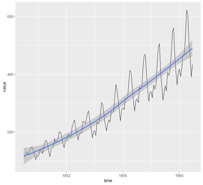 > ggplot(data=airpassenger) + geom_line(mapping = aes(x=time, y=value)) + geom_smooth(mapping = aes(x=time, y=value), method = 'loess')