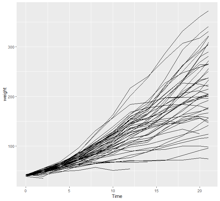 > ggplot(data=chick) + geom_line(mapping=aes(x=Time, y=weight, group=Chick))