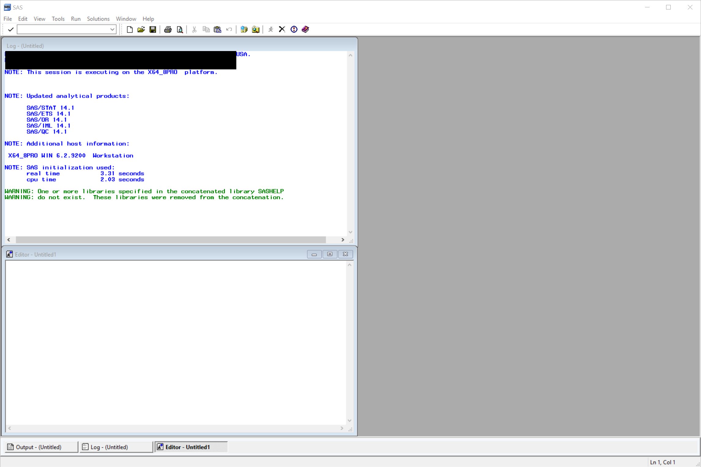 Top-left window is the Log window. The Log window enables you to view messages about your SAS session and your SAS programs. If the program that you submit has unexpected results, then the log helps you to identify the error. If you cannot see the Log window, you can reopen it from the main menu View -> Log.