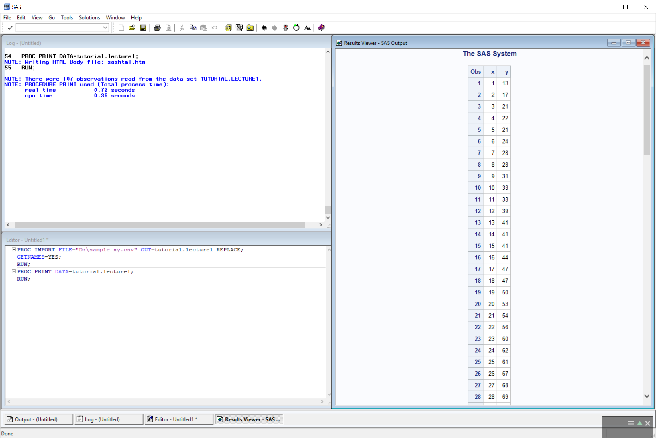 If import is successful, you will see a bunch of code in your Log window. Before further digging into PROC IMPORT, you may want to see the imported data. To do this we use PROC PRINT: