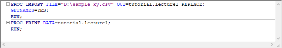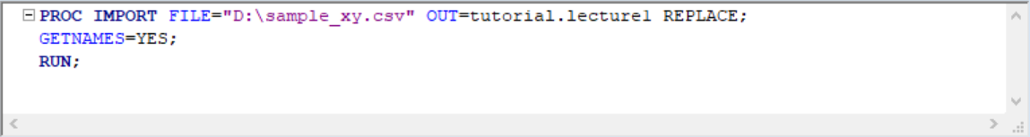 calls IMPORT procedure and FILE argument specifies the complete path and filename for the input PC file, spreadsheet, or delimited external file. In our case it's FILE="D:\sample_xy.csv".
