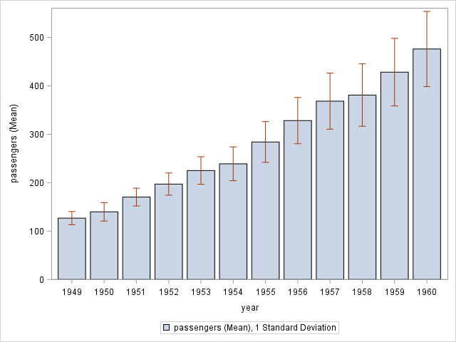 VBAR year / RESPONSE=passengers STAT=MEAN LIMITSTAT=STDDEV FILLATTRS=(COLOR=RED TRANSPARENCY=0.5);