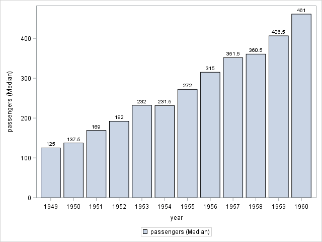 Bar graphs are excellent at summarizing complex data on the go. If you had a chance to look at the airpassenger data we used for scatter plots above, you would notice that the air passenger count is given per month. Let's say we only want to see the year averages. VBAR, HBAR, VLINE and HLINE (V for Vertical and H for Horizontal) arguments of SGPLOT offer such analysis on the go. Here is how we do it: