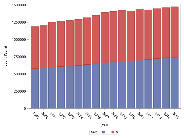 While visually appealing, I find stack charts of little value in terms of communicating data. We can see that overall cancer case is increasing but it's very difficult to tell how it affects different genders. Is the overall increase due to increase of cases in females alone or do males show similar tendency? It's difficult to tell from the graph alone. To see this clearly we have to tell SAS how to plot groups: