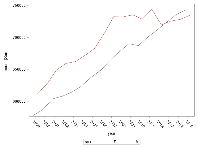 VLINE year / RESPONSE=count GROUP=sex GROUPDISPLAY=CLUSTER;