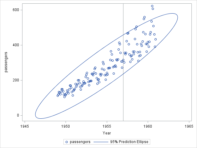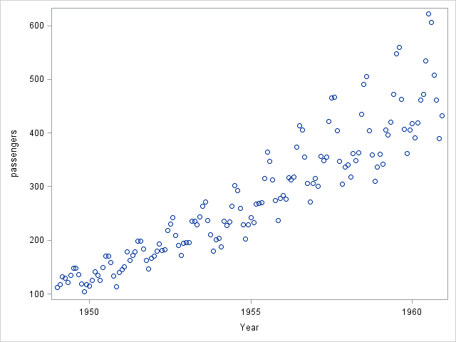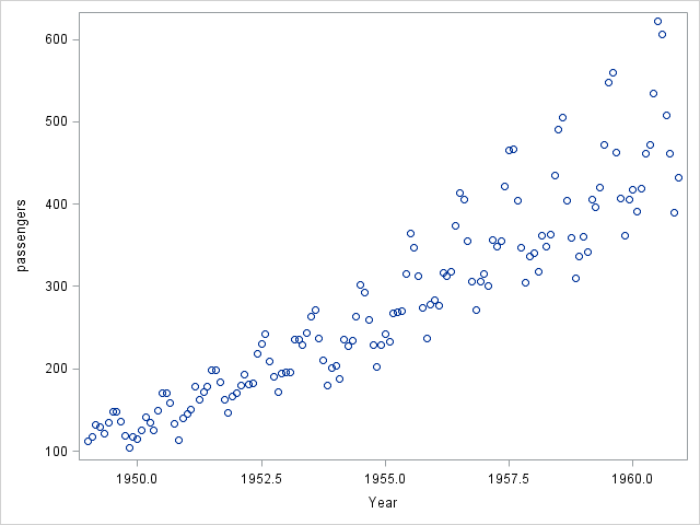 One way to plot scatter graphs is by invoking the SGPLOT procedure. Let's take a look at the monthly airline passenger data in the US between 1949 and 1960 (download data set here).