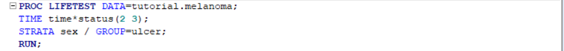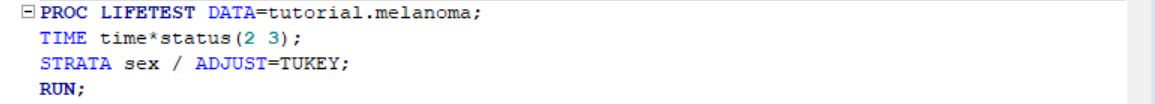 TIME statement specifies the time variable and STATUS specifies whether the event is censored or not. We know that only status=1 denotes death from melanoma, 2 and 3 are censored data. Here is the survival plot from the output: