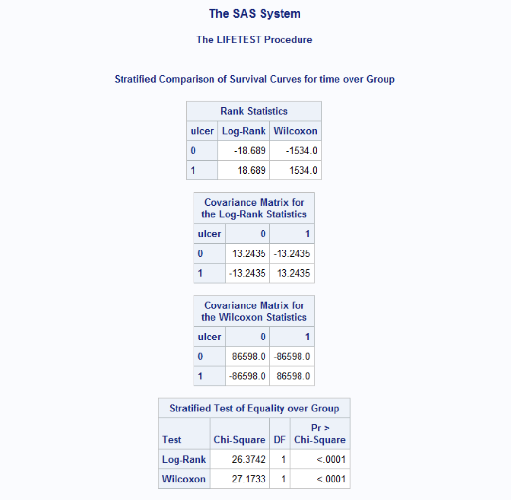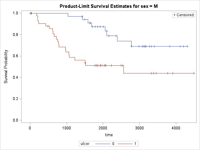 Results are shown for both Logrank and Wilcoxon tests. Both tests have p-values less than 0.05 therefore the effect of gender is significant. Note that Wilocoxon test gives more weight on shorter survival times and the difference of survival between genders at early onset gives raise to more significant p-value to Wilcoxon compared to Log-Rank. Now let's see the effect of ulcer on survival times while adjusting for gender difference.