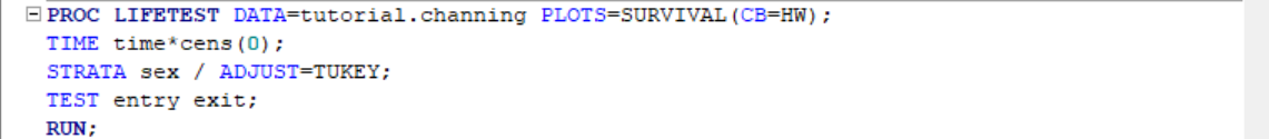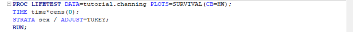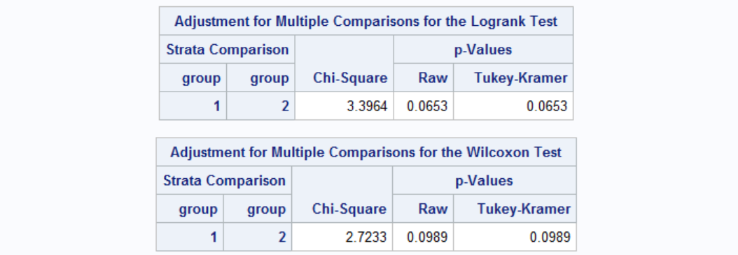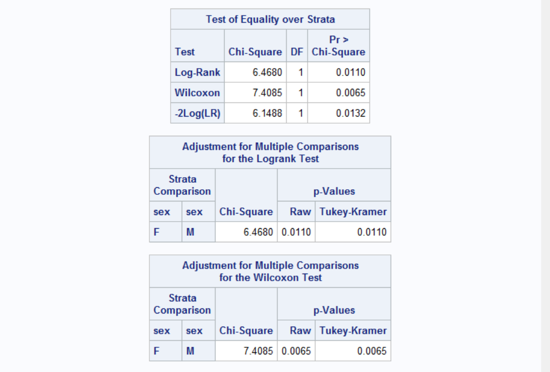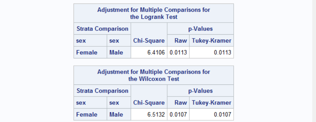 As can be seen from the survival plot, females have longer survival times compared to males. But let's also get some test values to comment. We can add TUKEY test to our comparison of males and females. Here's how it's done with the results: