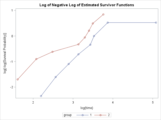 Let's also get Log and Log-Log survival plots in addition to Linear survival plot. We can do this by specifying the plots we would like to see in the PROC LIFETEST statement.