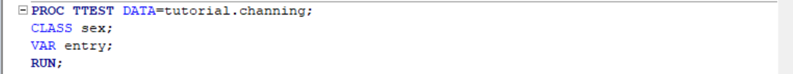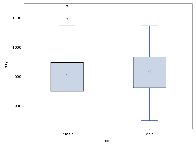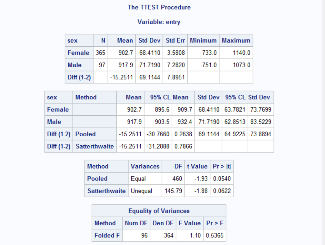 Effect of age is clearly significant for both genders. Therefore age effect is not favoring one gender over another. We can see this by testing age differences between females and males when they first enter the house. To do this, we can run a t-test with PROC TTEST.