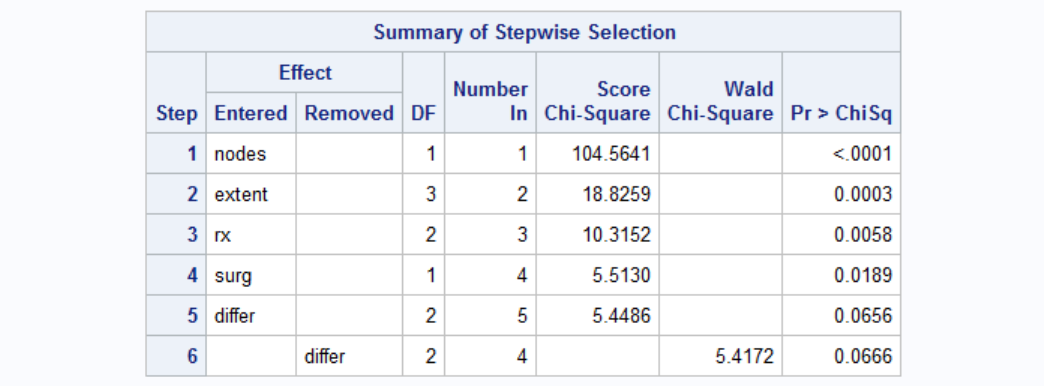 Results of stepwise selection of covariables are below. Covariables nodes, extent, rx, surg are significant whereas others are not (Note I ran this analysis before that's why I specified HAZARDRATIO for the selected variables only - it would not be apparent at first to you.).