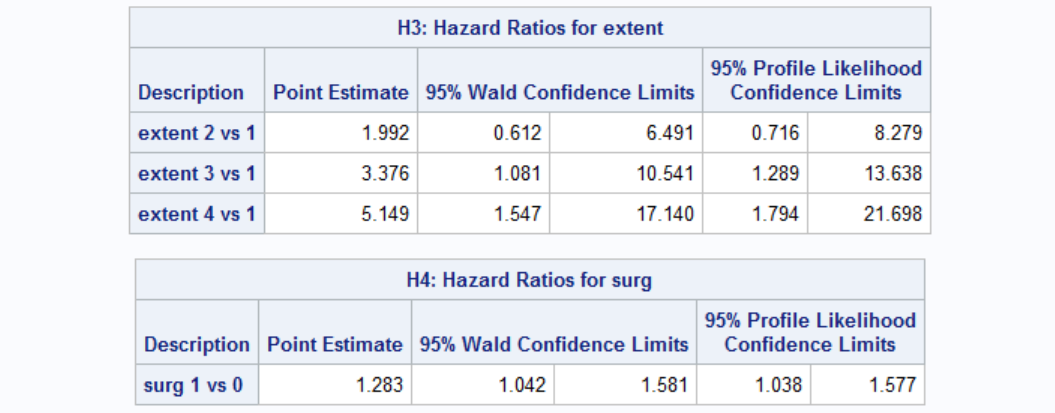 You can see below the hazard ratios for extent and surg. Interpretation of the results are similar.