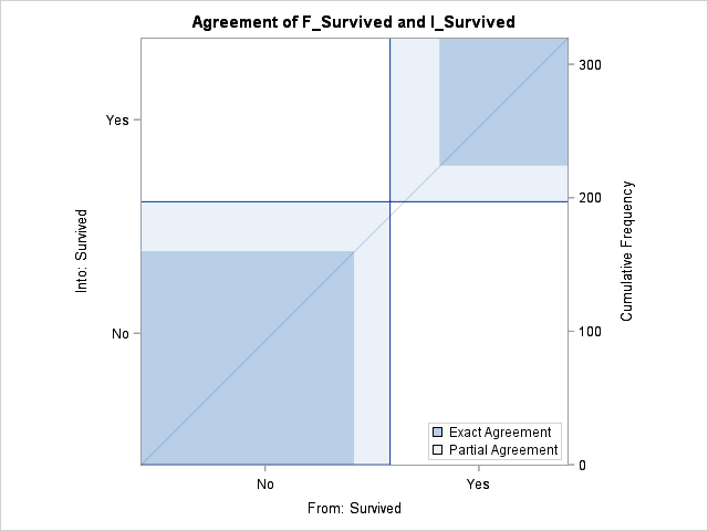When saving scores, SAS puts two columns in the output: f_survived and i_survived for each observation. f_survived is the value of survived in the titanic_test dataset and i_survived is the estimated value of the survival based on the logistic model. Therefore the more agreeement between these columns, the better our model is. We can utilize PROC FREQ to see how good our estimates are: