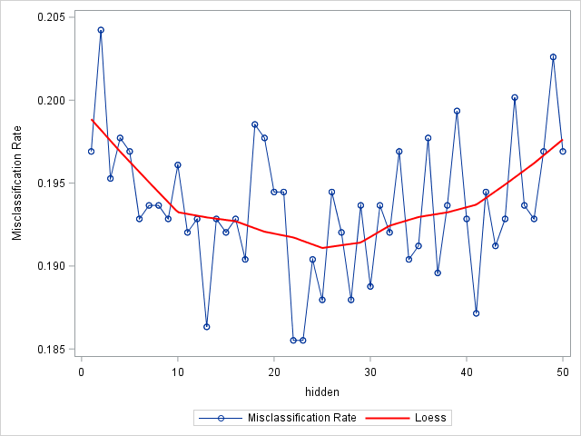 HIDDEN statement specifies the number of hidden layers in the network and the number of neurons in each hidden layer. The first HIDDEN statement specifies the number of hidden neurons in the first hidden layer. The second HIDDEN statement specifies the number of hidden neurons in the second hidden layer, and so on. A maximum of 100 HIDDEN statements are allowed. You must specify number, and it must be an integer greater than or equal to 1. Here's the effect of number of hidden layers for the first layer on the misclassification rate (for this case):