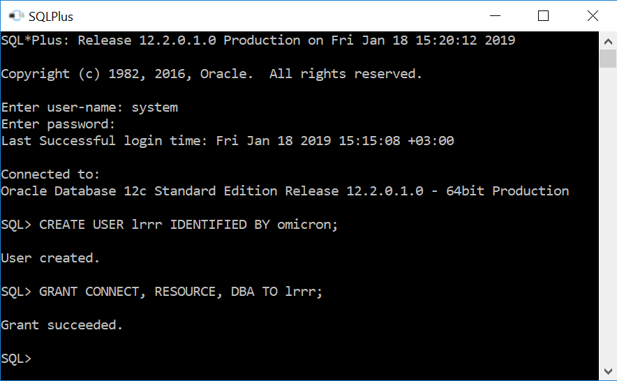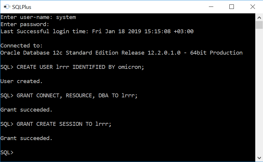 Now we need to assign a role to our newly created user. You can limit the role to a plain user with CONNECT argument or add more with RESOURCE and DBA arguments.